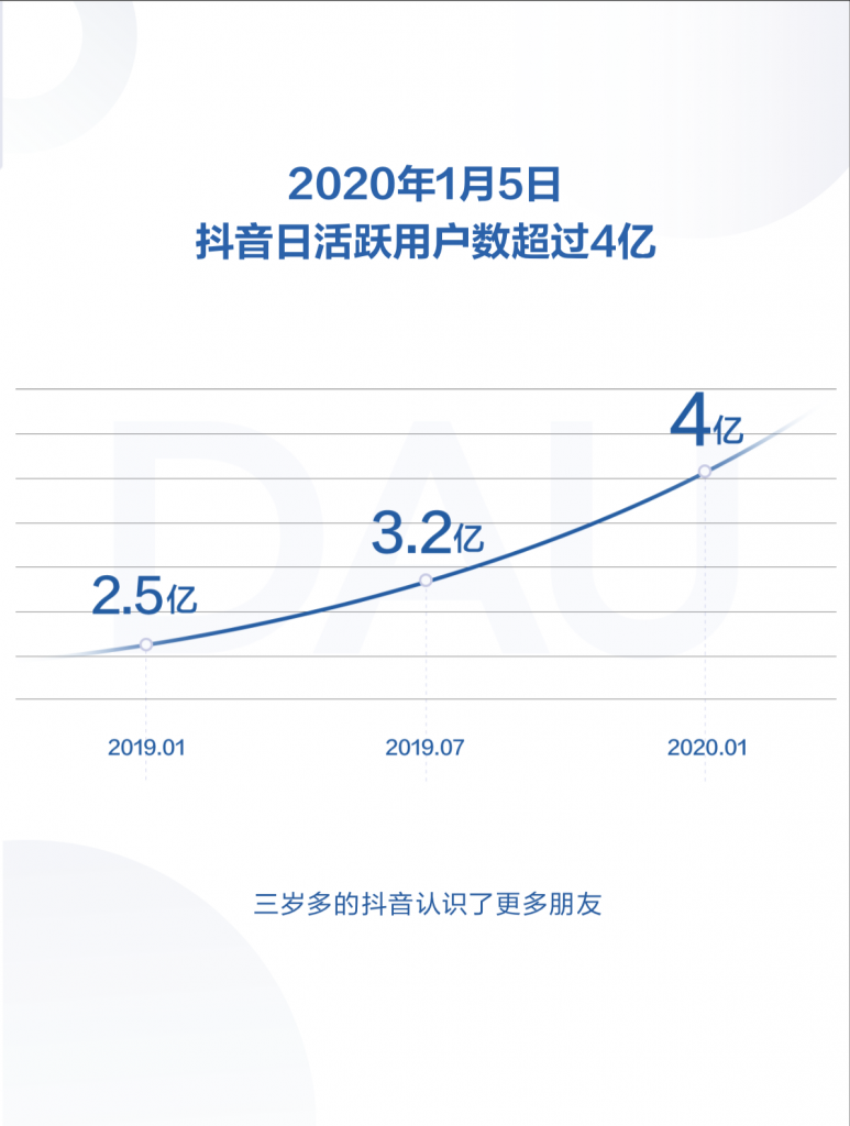 直至2020年1月,三歲多的抖音每天活躍的用戶人數已經超過4億。 抖音的用戶人數從2019年1月的2.5億,在半年內上升至3.2億,最終在2020年的1月份到達4億。