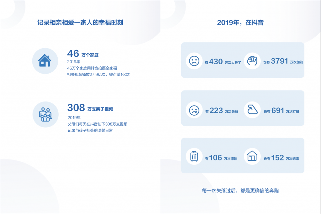 抖音在整個2019年為46萬個家庭記錄了全家福,這些全家福總共被播放了27.9億次,有·1億次的點讚數。 各地的父母用抖音短視頻記錄孩子温馨的,調皮的,可愛的日常。 每天有高達308萬支影片可以讓全世界的人看到自家孩子的不同面貌,這些親子視頻記錄了孩子的成長。 每一次的失敗和失落,都時讓我們更堅強,更確信自己,就如同每件事都有正反兩面。 各位在2019年的抖音裡有好也有壞,有430萬次的太難卻有3791萬次的加油;有223萬次的失敗就有691萬次的打拼;有106 萬次的漂泊也有152萬次的想家。 抖音除了給大家帶來挫折,同時也給大家帶來了更多的鼓勵和支持。