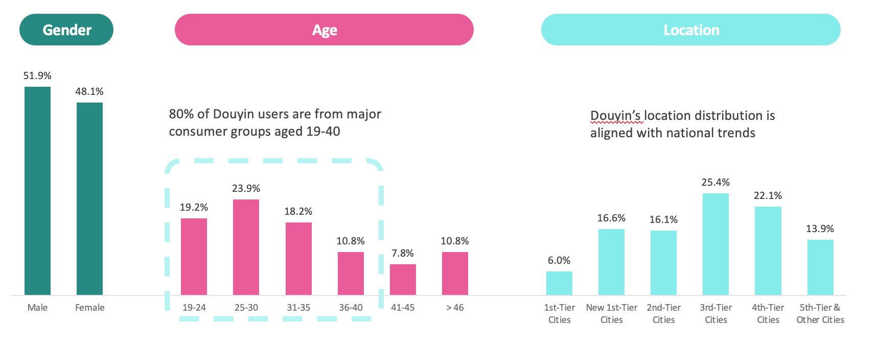 Douyin user’s demographic data: male gain 52.2%, females get 47.8%; main age group is 25-30 (24.8%) ,31-35 (22.9%) and 19-24 (21.7%).